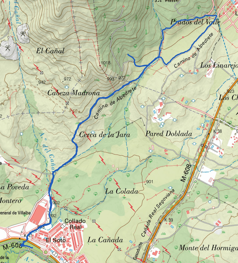Cruzamos la carretera M-608 por debajo del puente que da paso al arroyo de la Poveda y dirigiéndonos hacia el Hospital Universitario, junto al arroyo del Cañal, tomamos el llamado Camino de Alpedrete.