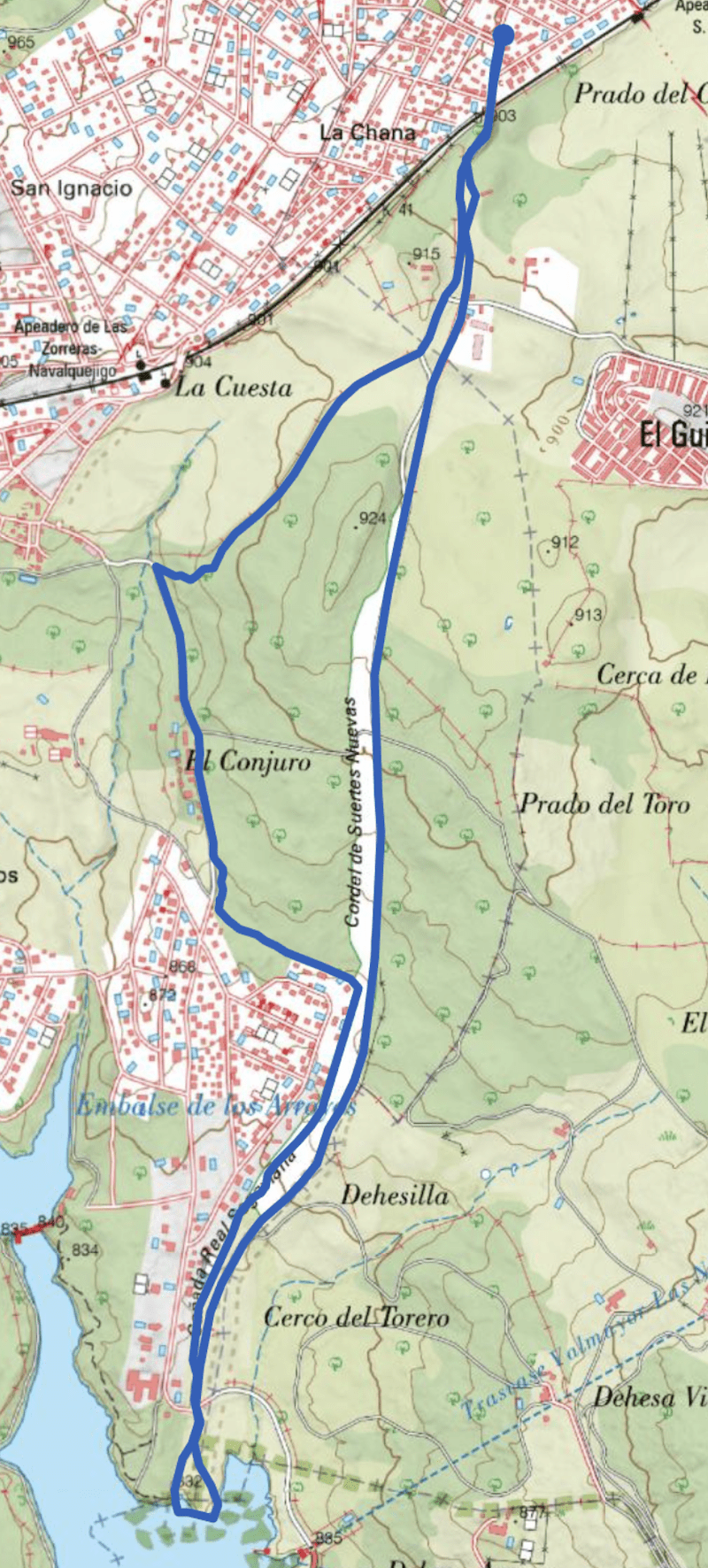 Ahora subimos por la margen izquierda de la cañada y en un punto determinado, giramos más a la izquierda en dirección a Navalquejigo, caminando por un sendero más estrecho y rodeado de jaras, retama y pequeñas encinas que nos deja en la zona del Conjuro con sus paisajes típicos de dehesa.